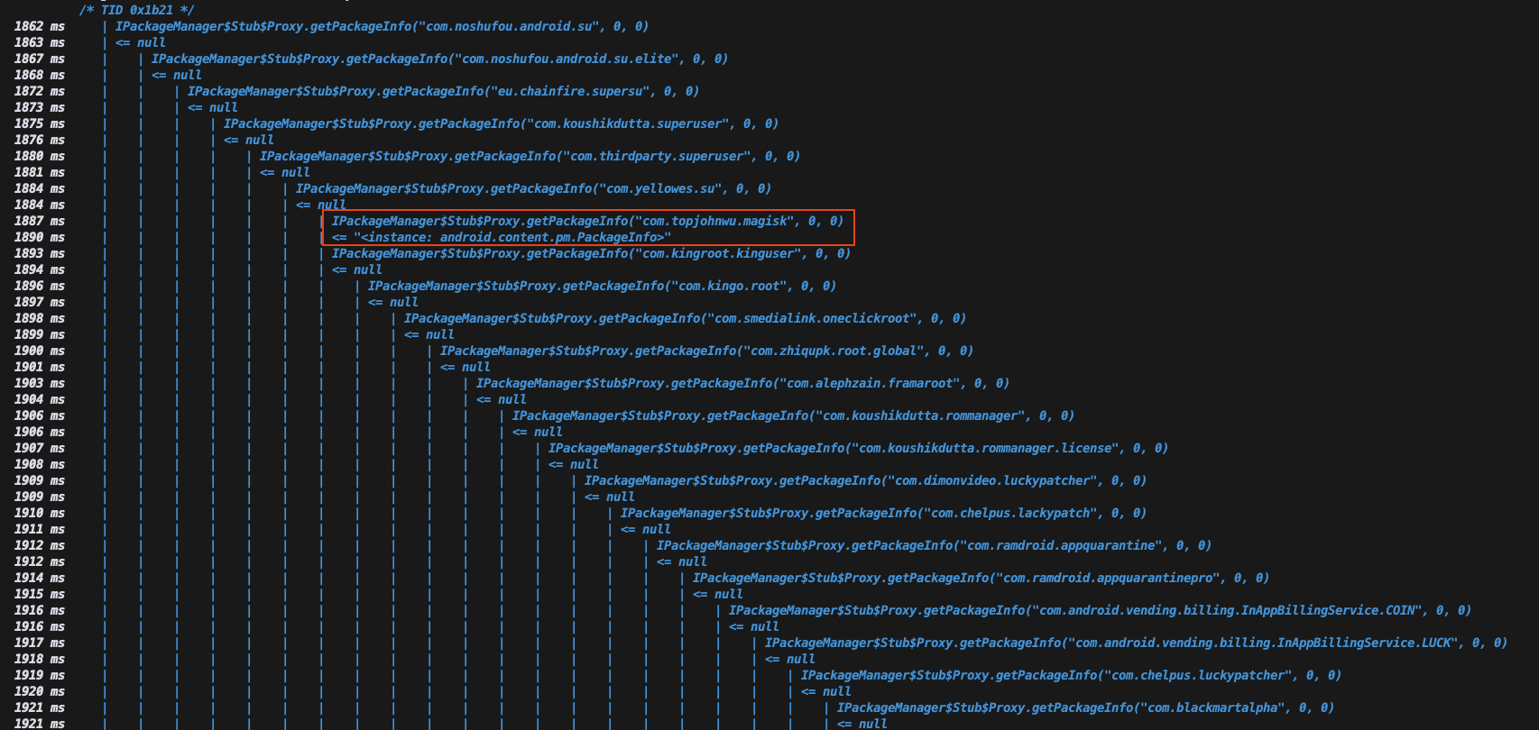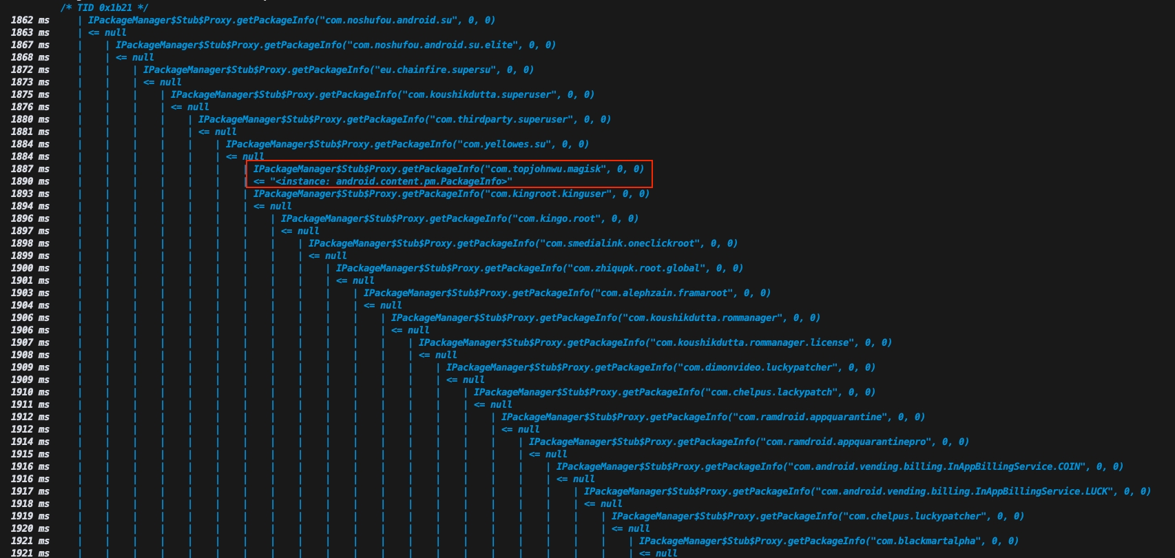 To do that we will frida-trace this function to see which of those root packages are present at my device