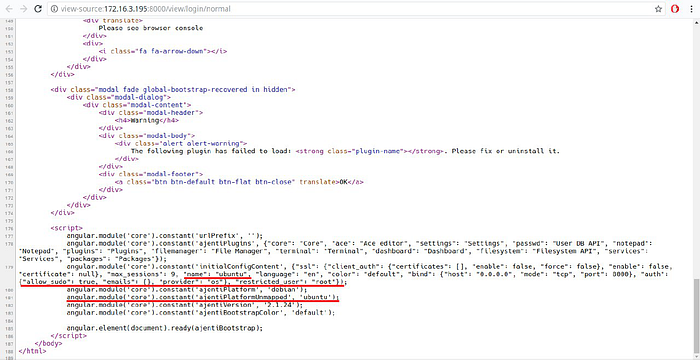 While conducting a vulnerability research on the application, i’ve started a code enumeration to understand how the application works. With this, I identified an information disclosure in the source code of the login page, that returns valuable information such as: operational system of the server, and the username of the Super user registered by the administrator of the server(super users are users that are allowed to use sudo command). Studying the application, i saw that this information comes from the /etc/ajenti/config.yml and this is imported by the angularJS on source code.